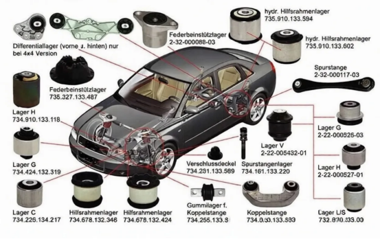 1. सस्पेंशन सिस्टम:सस्पेंशन में, रबर की झाड़ियाँ घटकों को जोड़ने, झटके को अवशोषित करने और सटीक संरेखण बनाए रखने का काम करती हैं - जिससे वाहन की हैंडलिंग और सवारी आराम दोनों में वृद्धि होती है।