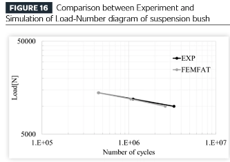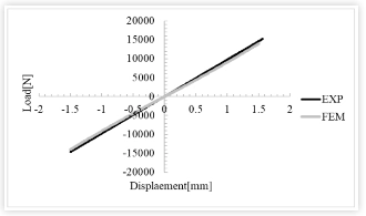 बुशिंग कठोरता वक्र (बल-विस्थापन वक्र) की तुलना प्रयोगात्मक परिणामों से की जाती है, जो आगे चलकर स्थापित FEM मॉडल की वैधता को साबित करती है। जैसा कि चित्र से देखा जा सकता है: सामग्री परीक्षण नमूनों से पहचाने गए हाइपरलास्टिक मापदंडों का उपयोग करके विश्लेषण लोड-विस्थापन आरेख पर प्रयोगात्मक और विश्लेषणात्मक परिणामों के बीच अच्छी स्थिरता दर्शाता है।