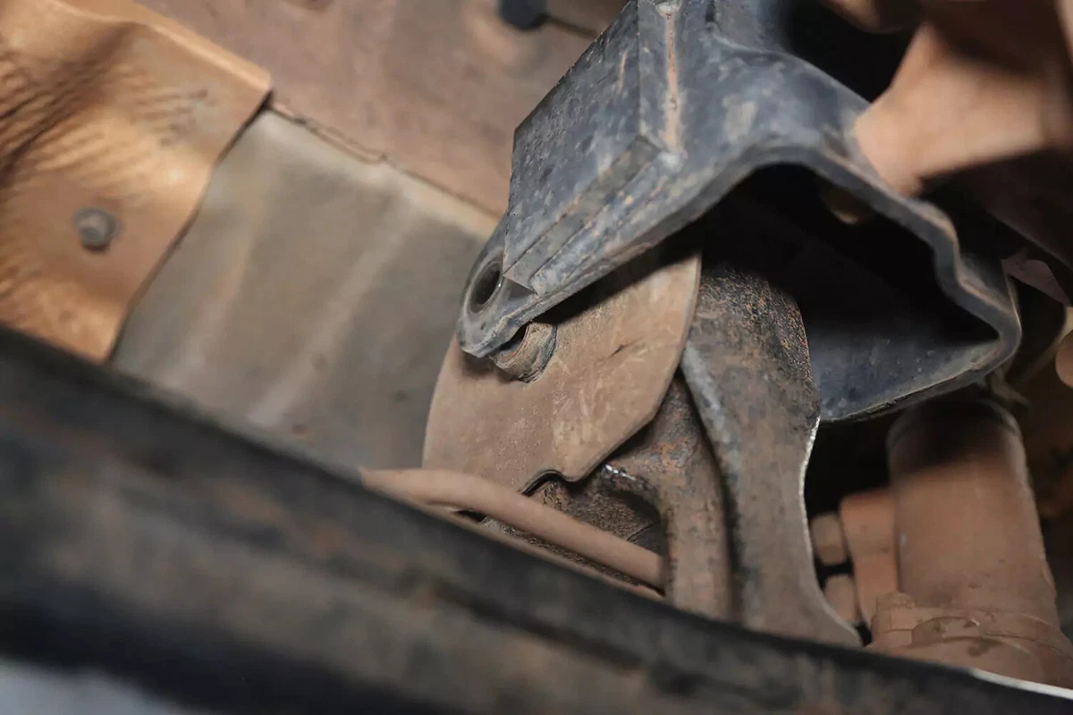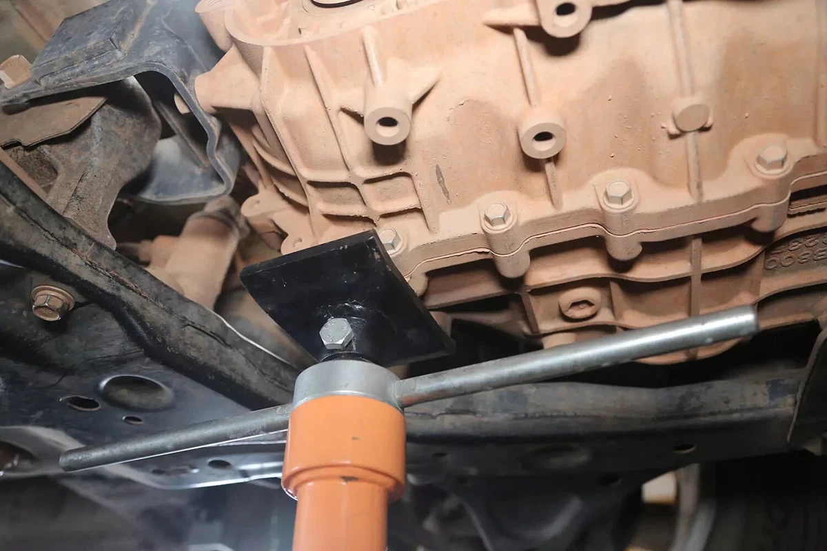 हमारे डेमो वाहन पर, सपोर्ट नॉच हैं जो माउंट को ट्रांसमिशन माउंट ब्रैकेट में लॉक कर देते हैं। माउंट को मुक्त करने के लिए हमें अतिरिक्त लिफ्ट लगाने की आवश्यकता थी।