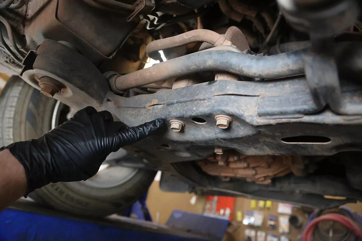 हमारे FWD डेमो वाहन पर, ट्रांसमिशन माउंट फ्रंट सबफ़्रेम पर ट्रांसमिशन के पीछे स्थित होता है। यदि आपके पास AWD, 4WD, या RWD वाहन है, तो माउंट संभवतः ट्रांसमिशन के बिल्कुल पीछे, ट्रांसमिशन और क्रॉसमेम्बर के बीच, लगभग सीधे कार के नीचे केंद्रित होता है।