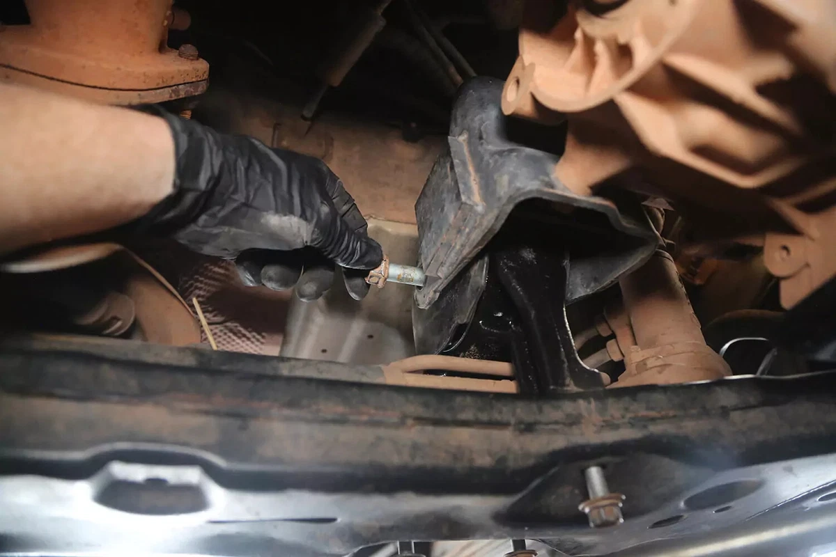 क्रॉसबोल्ट हटाएँ. फिर, चेसिस से ट्रांसमिशन माउंट बोल्ट हटा दें।
