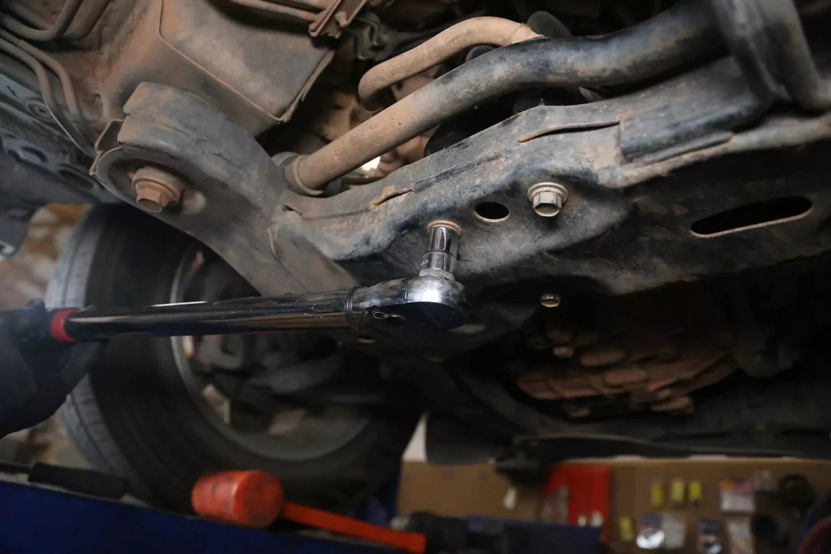 चेसिस माउंट बोल्ट और क्रॉसबोल्ट को कस लें। फ़ैक्टरी स्पेक्स पर बोल्ट कसने के लिए टॉर्क रिंच का उपयोग करें।