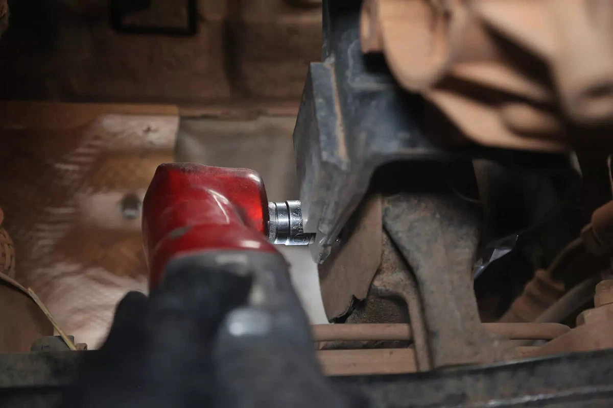 हमारे डेमो वाहन में एक क्रॉसबोल्ट है, जिसे एक तरफ रिंच और दूसरी तरफ सॉकेट का उपयोग करके हटा दिया जाता है। तंग इलाकों में इन्हें हटाना कठिन हो सकता है। आवश्यक उत्तोलन प्राप्त करने के लिए ब्रेकर बार, इम्पैक्ट रिंच, या चीटर बार का उपयोग करें।